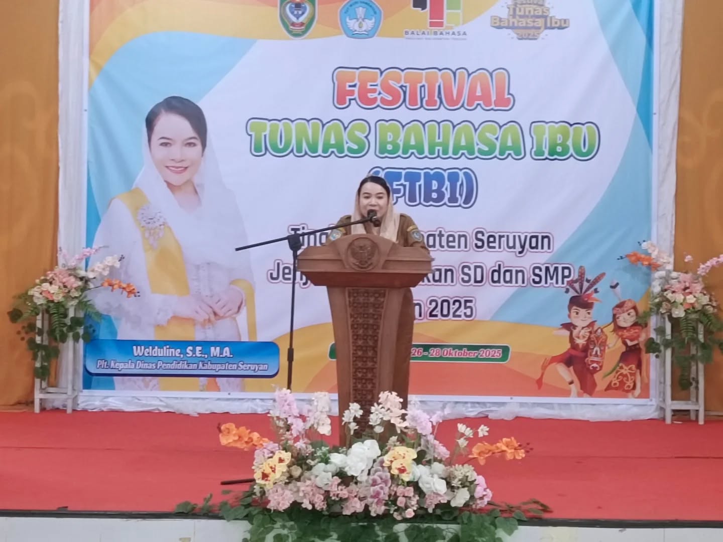 Kepala Dinas Pendidikan (Kadisdik) Kabupaten Seruyan Welduline, S.E, M.A , menutup Festival Tunas Bahasa Ibu (FTBI) Tingkat Kabupaten Seruyan Tahun 2025, di Gedung Serba guna, Kota Kuala Pembuang, Selasa (28/10/2025)